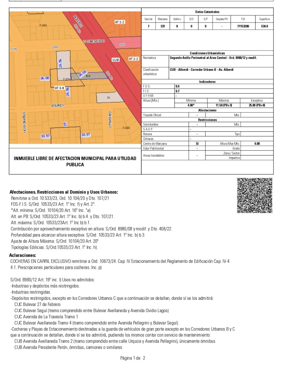 Atención constructoras !! AV. ALBERDI al 200, casi esquina Velez Zarfield Amplio terreno en venta. Sobre corredor urbano Av. Alberdi, zona en crecimiento. Se aceptan metros en parte de pago. Terreno de 533 m2, orientación este- oeste, de 12 m de frente y 56,60 me en medianera sur y 50m en medianera norte. Se puede hacre PB y 8 pisos con exceptiva POSIBLIDAD DE COMPRA DE LOS LINDEROS